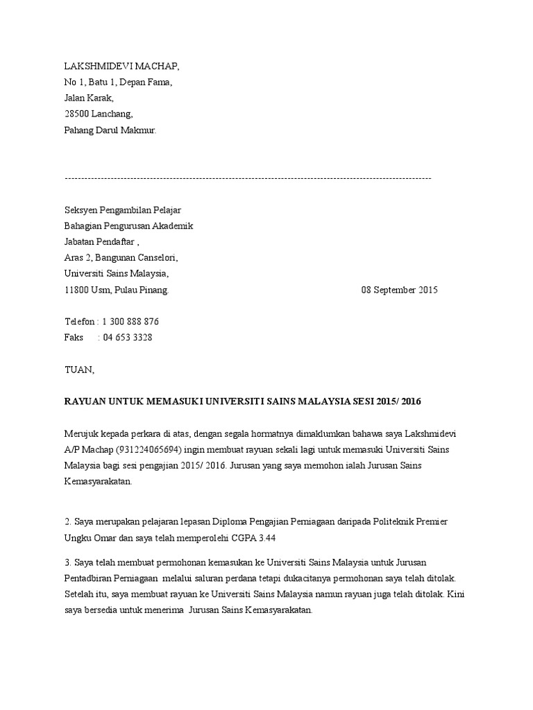 Nor fhakira binti abd wahab 133 felda keratong 2 26900 bandar tun razak. Contoh surat rayuan kemasukan universiti contoh surat permohonan upu kumpulan contoh surat dan soal terlengkap.